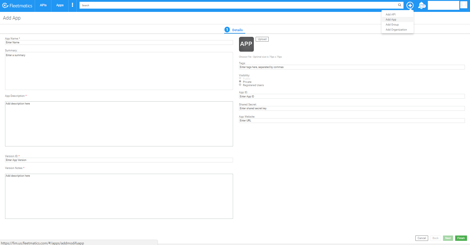 6. Set your visibility to PRIVATE to ensure only you and REVEAL support can see your APP within the integration manager App list.