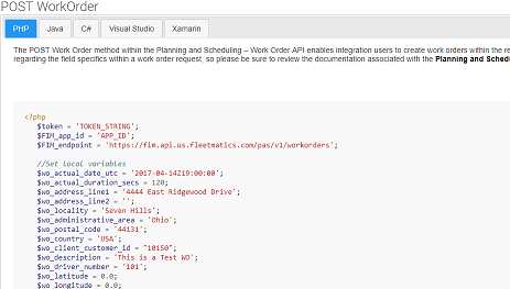 2. Visit the Integration Manager’s Help center to review the code sample options available, including POST Work Order which will be required for this integration.