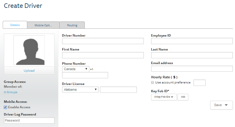 The Driver will need the MOBILE ACCESS option selected with a password that will be provided to the driver to access the App. Additionally, when Mobile Access is selected, the Email Address for the driver must be completed.